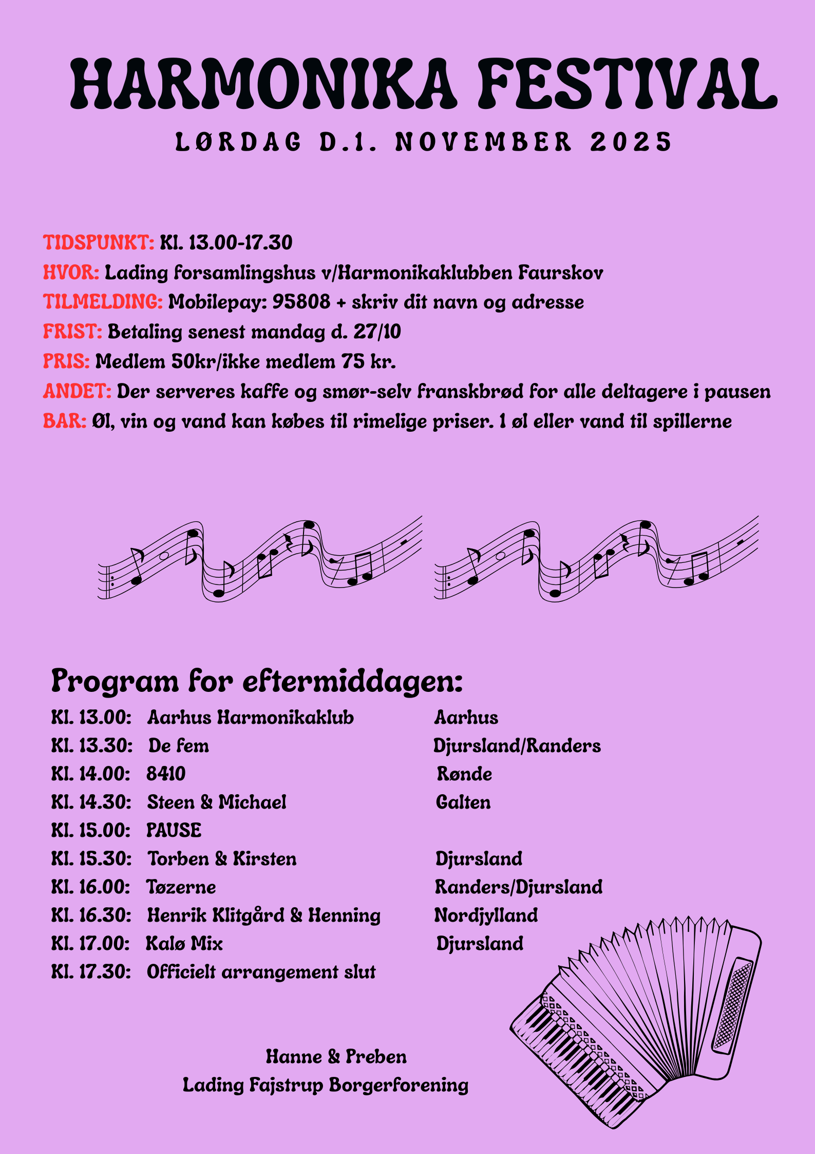 Category: Forenings Arrangementer Harmonikafestival Lading-Fajstrup Borgerforening og Forsamlingshus Udgivet den 20 januar, 2025 af Webmaster7 oktober, 2025 Harmonikafestival 13:00 – 17:301 november, 2025 Lading ForsamlingshusViborgvej 882Sabro, 8471DanmarkSe LokationenKort Lading Forsamlingshus iCal Google Kalender Se hele kalenderen
